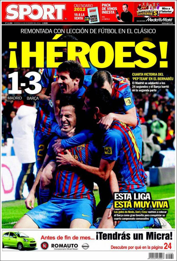 SPORT EROI – Sono davvero finiti gli aggettivi per questo Barça che viene soprannominato “degli eroi”. Eroica è infatti la prestazione vista ieri nel Clasico, vinto contro il Real Madrid. Bella fotonotizia del quotidiano spagnolo Sport, che apre con una foto dei Blaugrana.