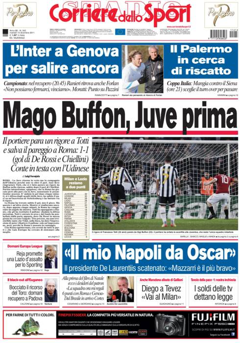 CORRIERE BUFFON JUVENTUS – Sul Corriere dello Sport viene elogiato Buffon che ieri ha parato un rigore a Totti.