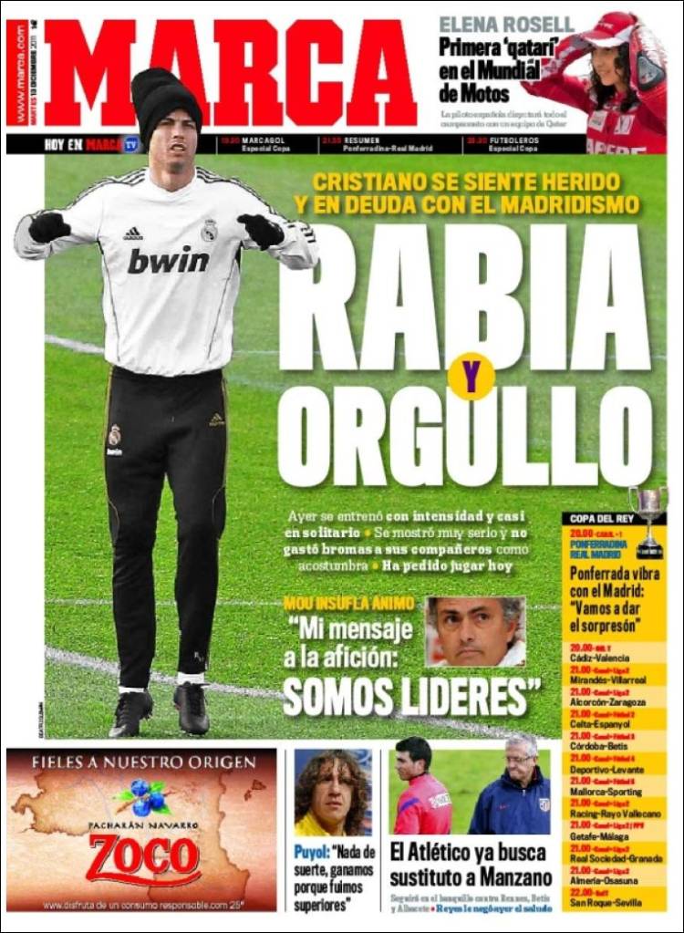 MARCA RONALDO – Sul quotidiano Marca si parla di Ronaldo che ha deluso contro il Barcellona. Il portoghese vuole riscattarsi.