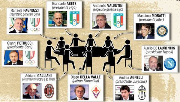 ORE 11.45 – Potrebbe trattarsi di un falso allarme e il tavolo potrebbe non essere ancora concluso. Nel frattempo ecco la disposizione: da sinistra a destra: De Laurentiis, Della Valle, Agnelli, Pagnozzi, Petrucci, Abete, Valentini, Galliani, Moratti
