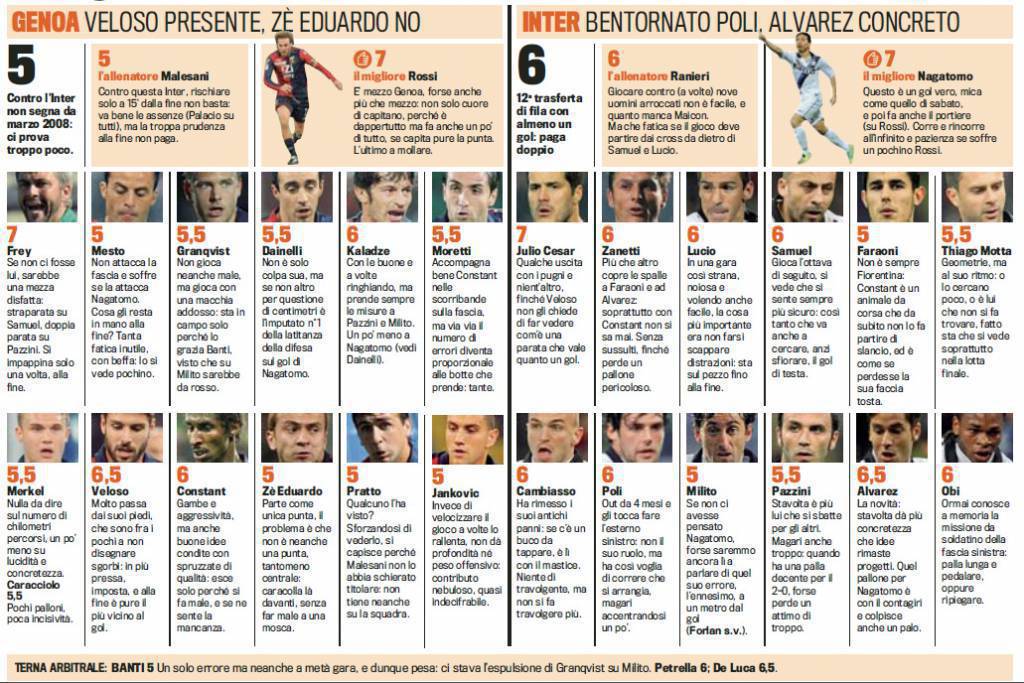 CALCIO SERIE A GENOA INTER PAGELLE VOTI – L’Inter esce da Genoava con una vittoria importantissima e tre punti che rendono la situazione in clasifica decisamente meno buia. Voti non alti, quelli assegnati ai nerazzurri dalla Gazzetta dello Sport, sugli scudi il giapponese Nagatomo, autore del gol partita, e Julio Cesar, protagonista con una grande parata su Veloso. Da segnalare il buon 6,5 di Alvarez, autore di una prova tutta sostanza. Nelle fila del Genoa spiccano le prestazioni di Rossi e Frey, che è riuscito a contenere il passivo.
