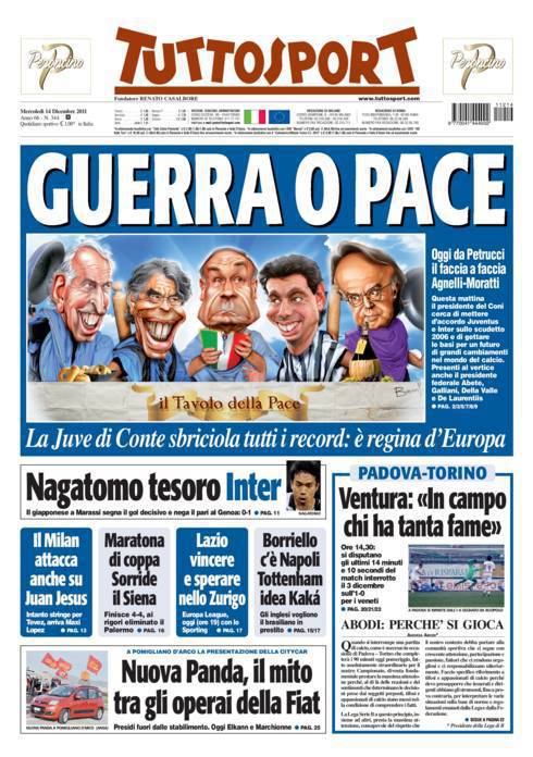 RASSEGNA STAMPA TUTTOSPORT CALCIOPOLI JUVENTUS INTER FIORENTINA – Oggi Petrucci incontrerà Agnelli e Moratti per discutere delle vicende di calciopoli. Nasce dunque il tanto discusso tavolo della pace. O sarà guerra?