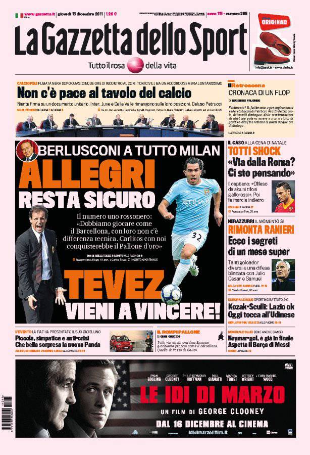 GAZZETTA BERLUSCONI – Sulla Gazzetta dello Sport vengono riportate le dichiarazioni di Silvio Berlusconi, patron del Milan, che ha parlato del rinnovo di Allegri e di Tevez.