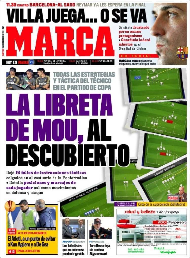 MARCA MOURINHO – Il quotidiano Marca mostra in esclusiva gli appunti di Mourinho durante il match di Coppa.