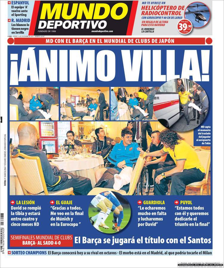 MUNDO DEPORTIVO VILLA – Sul quotidiano catalano Mundo Deportivo si parla di Villa, che ieri si è spezzato la tibia della gamba sinistra.