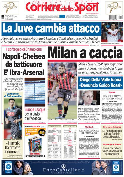 CORRIERE MILAN – Sul Corriere dello Sport si parla del Milan che va a caccia di Udinese e Juventus in campionato, mentre sul mercato prova a prendere Tevez.