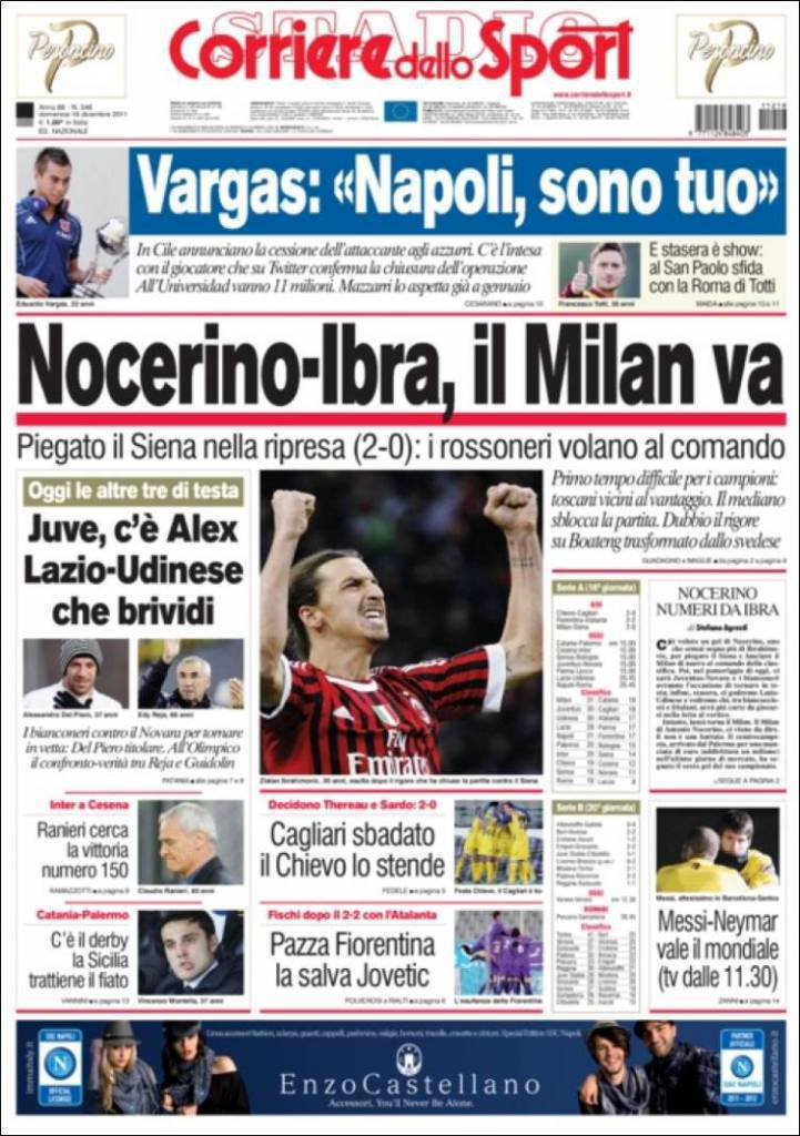 RASSEGNA STAMPA CORRIERE DELLO SPORT – Il Corriere dello Sport dedica la prima pagina alla vittoria del Milan. Nocerino e Ibrahimovic permettono a Massimiliano Allegri di guardare tutti dalla vetta della classifica aspettando le gare di Juventus, Udinese e Lazio. In taglio alto, spazio al Napoli e al suo nuovo acquisto Eduardo Vargas.