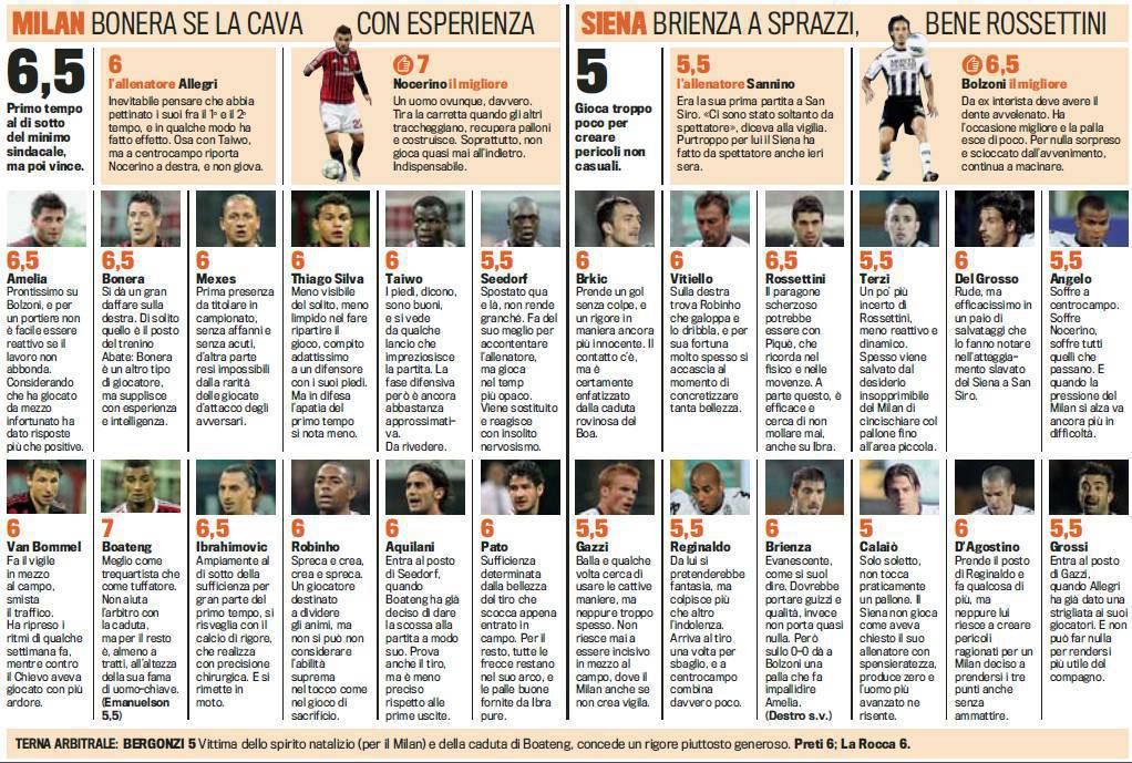 MILAN SIENA VOTI PAGELLE GAZZETTA – Il Milan riprende la sua corsa. Aspettando Lazio-Udinese e Juventus-Novara, i rossoneri vincono contro il Siena e si portano momentaneamente in vetta alla classifica. Accade tutto nel secondo tempo, prima Nocerino su tocco di Robinho trova il gol con un tiro dal limite dell’area (decisiva una deviazione di Bolzoni) e poi Ibrahimovic trasforma un calcio di rigore, molto dubbio. Ecco le pagelle della Gazzetta: