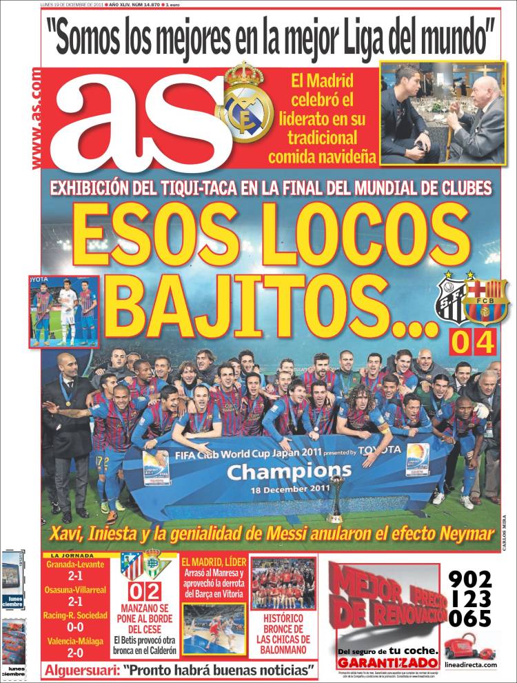 As: Quelli un po’ pazzi… 19/12/2011 di Ruggieri AS BARCELLONA – Il Barcellona è Campione del Mondo dopo aver battuto quattro a zero il Santos con doppietta di Messi. Claudio Ruggieri – www.calciomercatonews.com
