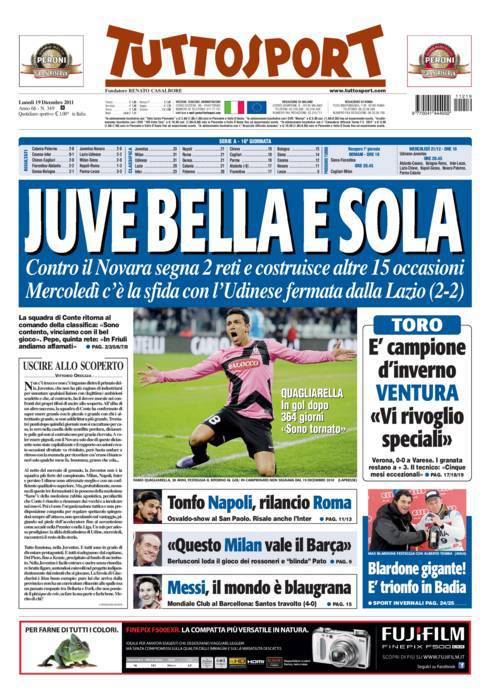 TUTTOSPORT JUVENTUS – Su Tuttosport si parla della Juventus che vince due a zero contro il Novara ed è sola in testa alla classifica.