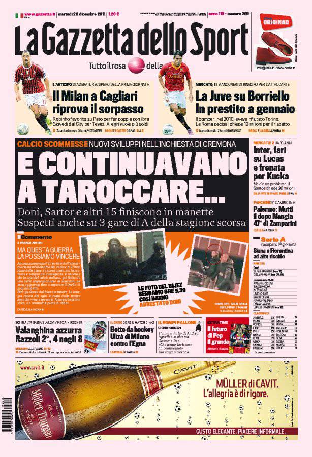 GAZZETTA CALCIOSCOMMESSE – La Gazzetta dello Sport parla dello scandalo calcioscommesse che ieri ha visto in manette Doni, Sartor e altre 15 persone.