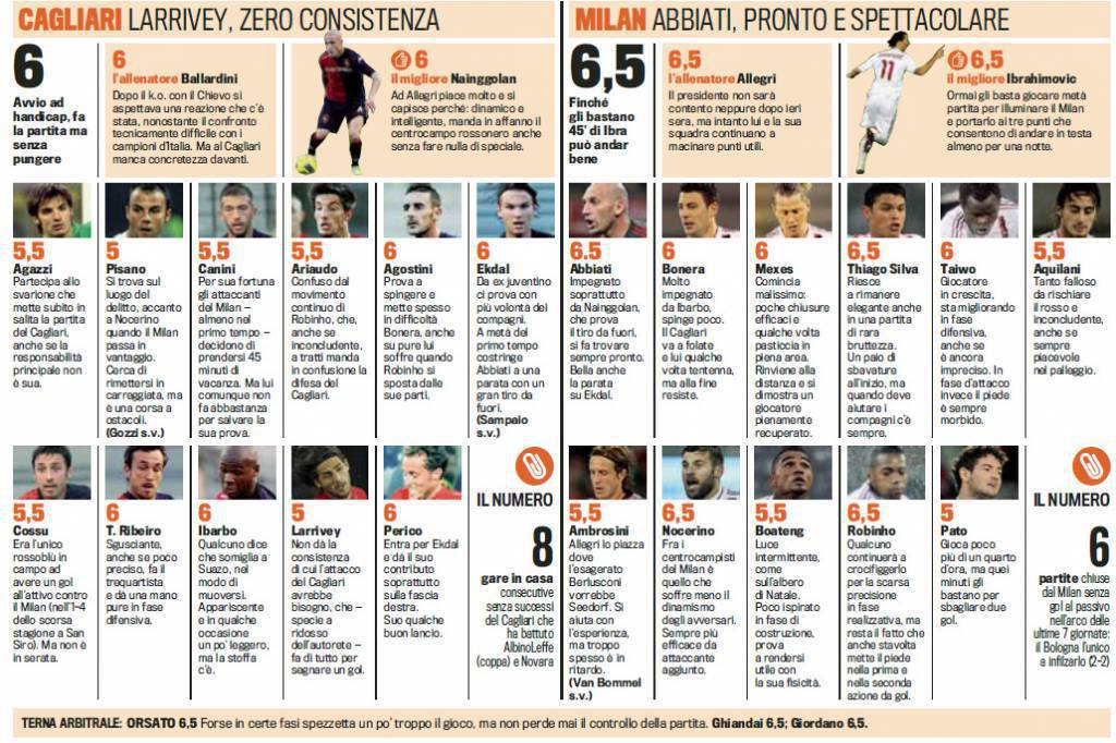 CAGLIARI MILAN VOTI PAGELLE GAZZETTA – Il Milan vince due a zero a Cagliari grazie all’autorete di Pisano e al gol di Zlatan Ibrahimovic. Lo svedese è sempre più protagonista del Milan. Buona comunque la prova dei sardi che hanno cercato di impensierire Abbiati dalla distanza, ma il portiere rossonero si è ben difeso. Buona prova di Nainggolan del Cagliari, il centrocampista belga è riuscito a fare buone cose. Nel Milan bene anche Nocerino che senza l’autogol di Pisano avrebbe segnato nuovamente. Ecco le pagelle della Gazzetta dello Sport.