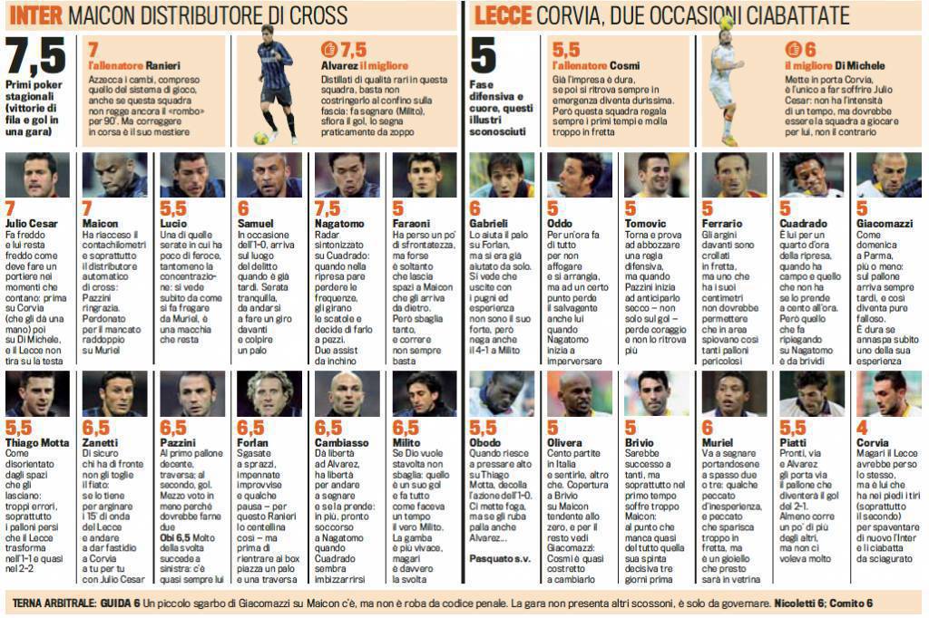 INTER LECCE VOTI PAGELLE GAZZETTA – L’Inter travolge il Lecce quattro a uno e infila il quarto successo consecutivo. I nerazzurri guidati da Ranieri prima subiscono il gol di Muriel, poi travolgono l’avversario colpendo quattro legni, ma prima Pazzini e poi Milito, Cambiasso e Alvarez affossano la squadra salentina. Migliore in campo il giovane argentino Alvarez, autore di una grandissima prova. Nel Lecce male Corvia che si divora due palle gol a dir poco clamorose. Bene il giovane Muriel. Ecco i voti e le pagelle della Gazzetta dello Sport.