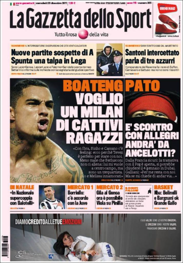 RASSEGNA STAMPA GAZZETTA DELLO SPORT MILAN BOATENG TEVEZ – Kevin Prince Boateng vuole una squadra a sua immagine e somiglianza, un Milan tutto grinta e cattiveria. C’è feeling con i compagni di reparto, il centrocampista è pronto ad accogliere a braccia aperte anche Tevez.