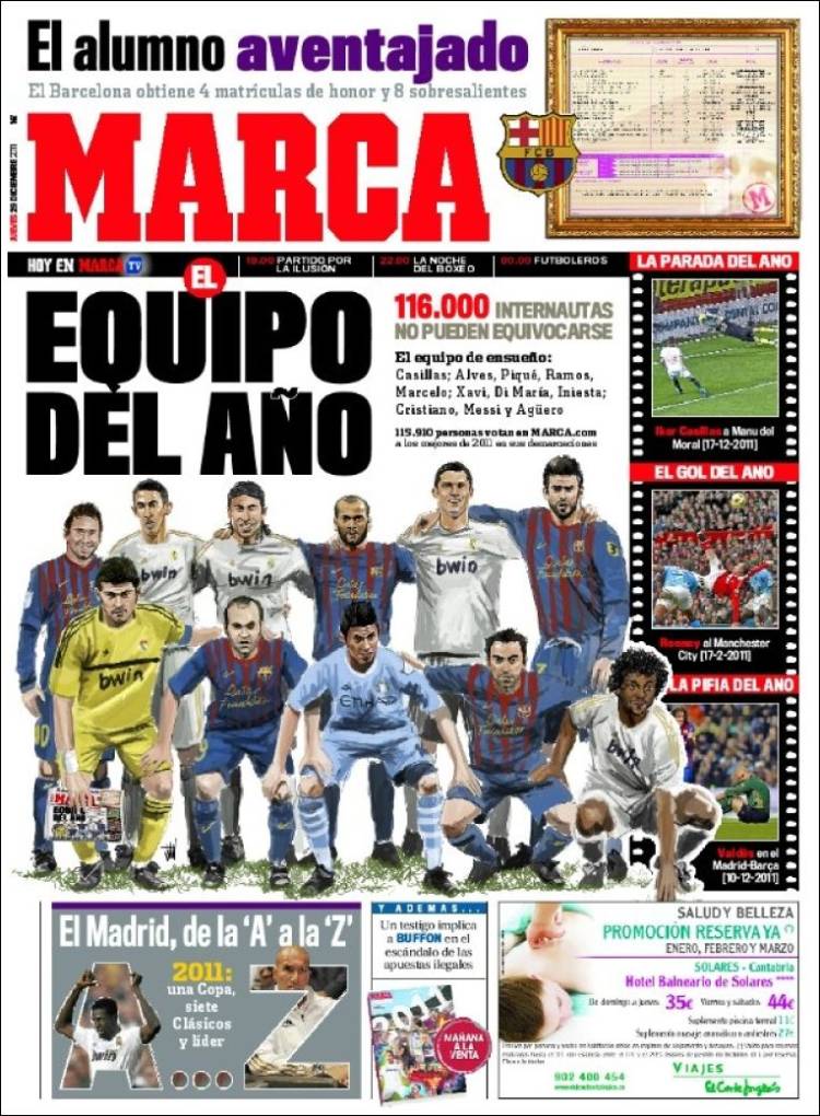 MARCA SQUADRA – Sul quotidiano Marca è stata votata la squadra dell’anno con cinque giocatori del Real Madrid e cinque del Barcellona più Aguero.