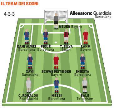 TEAM DEI SOGNI 2011 GAZZETTA ITALIANO – La Gazzetta dello Sport oggi ha pubblicato la formazione dei sogni di questo 2011 che sta per concludersi. Ovviamente l’allenatore non poteva che essere Pep Guardiola, autore di un altro anno eccezionale. Tanto Barcellona nella formazione ideale. In porta il portiere del Bayern Monaco Neuer, autore con lo Schalke prima e con il Bayern poi di prestazioni sontuose. In difesa a sinistra un altro del Bayern Monaco Lahm, a destra Dani Alves. Coppia centrale di fenomeni con Piquè del Barcellona e Thiago Silva del Milan, l’unico giocatore della Serie A presente. Centrocampo meraviglioso con il mastino del Bayern Schweinsteiger centrale, Xavi e Iniesta del Barcellona accanto a lui. Attacco delle meraviglie con Cristiano Ronaldo, Messi e Bale. Chissà quanto costerebbe una formazione così. Ecco la foto.