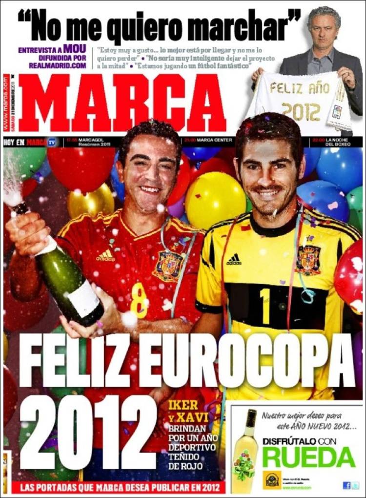 RASSEGNA STAMPA MARCA MOURINHO REAL MADRID XAVI CASILLAS – Josè Mourinho nonostante le tante voci di mercato che vorrebbero un suo ritorno in Inghilterra dichiara amore al Real Madrid dichiarando che il meglio della sua squadra deve ancora arrivare. Intanto le due bandiere di Barcellona e Real Xavi e Casillas si augurano di vivere un felice Euro 2012 e brindano a un anno di sport con la maglia della Spagna.