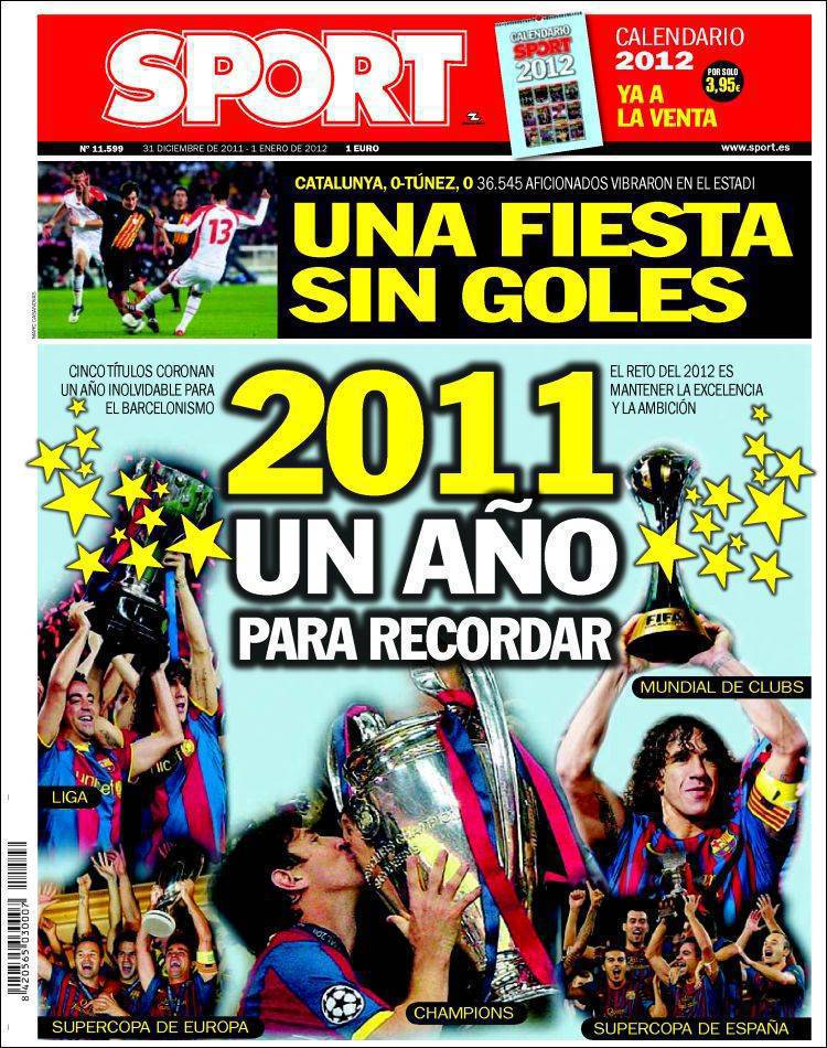 RASSEGNA STAMPA SPORT SPAGNA BARCELLONA – Il quotidiana spagnolo “Sport” dedica la prima pagina alla squadra più forte del mondo, il Barcellona che nel 2011 che sta per finire è riuscito a battere ogni record portando a casa cinque trofei: Liga, Champion’s League, Supercoppa di Spagna, Supercoppa d’Europa, Mondiale per club.
