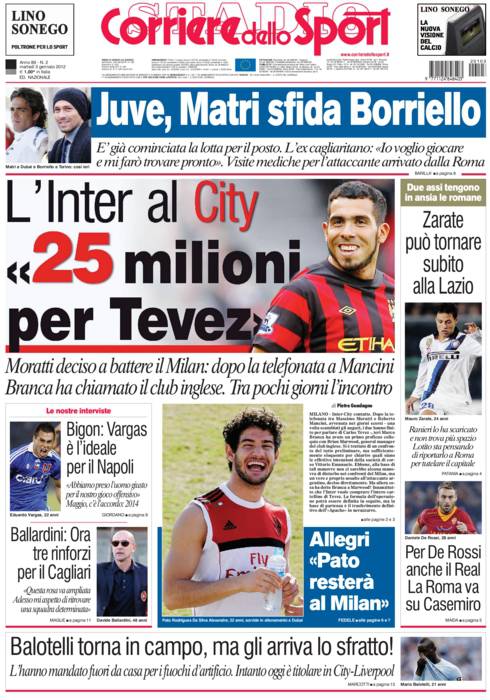 CORRIERE INTER CITY TEVEZ – Sul Corriere dello Sport si parla di Tevez con l’Inter disposta a offrire 25 milioni di euro.