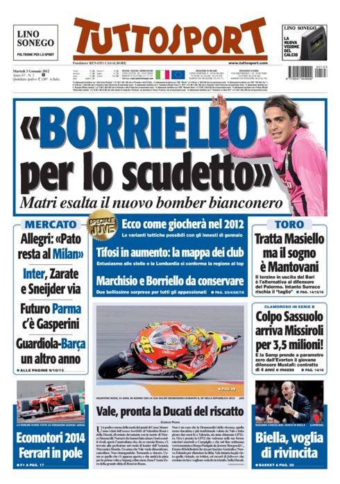 TUTTOSPORT BORRIELLO SCUDETTO – Su Tuttosport parla Matri che esalta il nuovo acquisto Borriello.