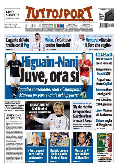 TUTTOSPORT HIGUAIN NANI JUVENTUS – Su Tuttosport si parla del doppio colpo Juventus per la prossima stagione, ovvero Higuain e Nani.