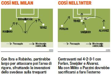 CALCIOMERCATO INTER MILAN TEVEZ – Carlitos Tevez è sicuramente il grande sogno di mercato di Inter e Milan. I rossoneri sono in vantaggio perchè hanno dalla loro il gradimento del giocatore, l’Inter ha fatto passi in avanti con il Manchester City ma questo potrebbe anche non bastare. La Gazzetta dello Sport ha provato a immaginare i due attacchi. Il Milan punterebbe su Tevez come spalla ideale di Ibrahimovic, magari in un tridente con Robinho largo a sinistra. Nell’Inter invece giocherebbe da prima punta con alle spalle i vari Forlan, Sneijder e Alvarez. Dove starebbe meglio?