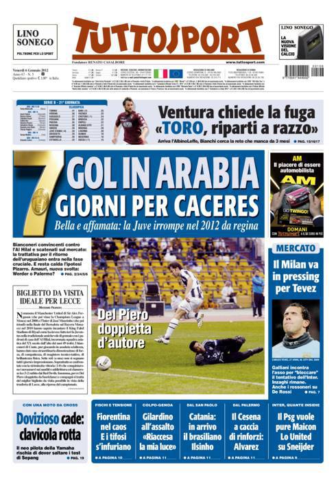 TUTTOSPORT JUVENTUS – Su Tuttosport si parla della Juventus che vince in amichevole in Arabia per sette a uno e intanto pressa il Siviglia per Caceres.