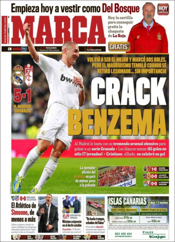 MARCA CRACK BENZEMA – Grande prestazione del Real Madrid quella di ieri sera che con 5 reti, ha risolto la pratica Granada. Sugli scudi il solito Cristiano Ronaldo, ma soprattutto Karim Benzema autore di una doppietta.