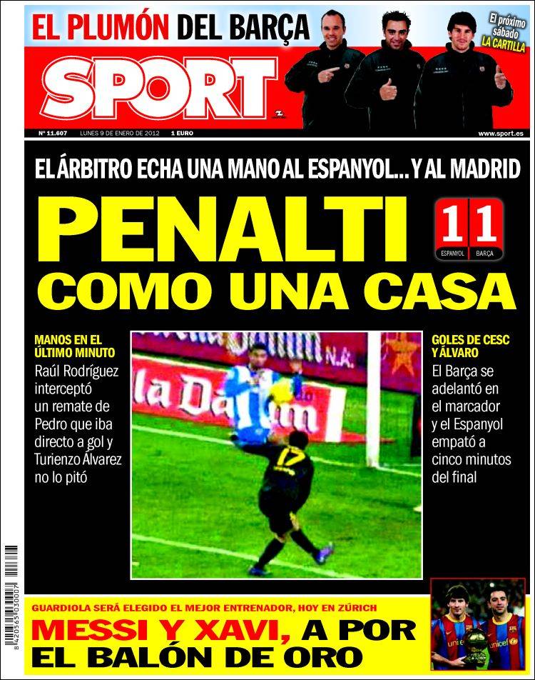 SPORT BARCELLONA – Anche il quotidiano Sport parla del rigore non dato al Barcellona e mostra la foto in prima pagina.