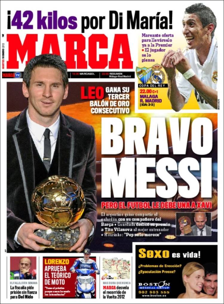 MARCA MESSI – Sul quotidiano Marca si parla di Messi che ha vinto il Pallone d’Oro per la terza volta consecutiva.
