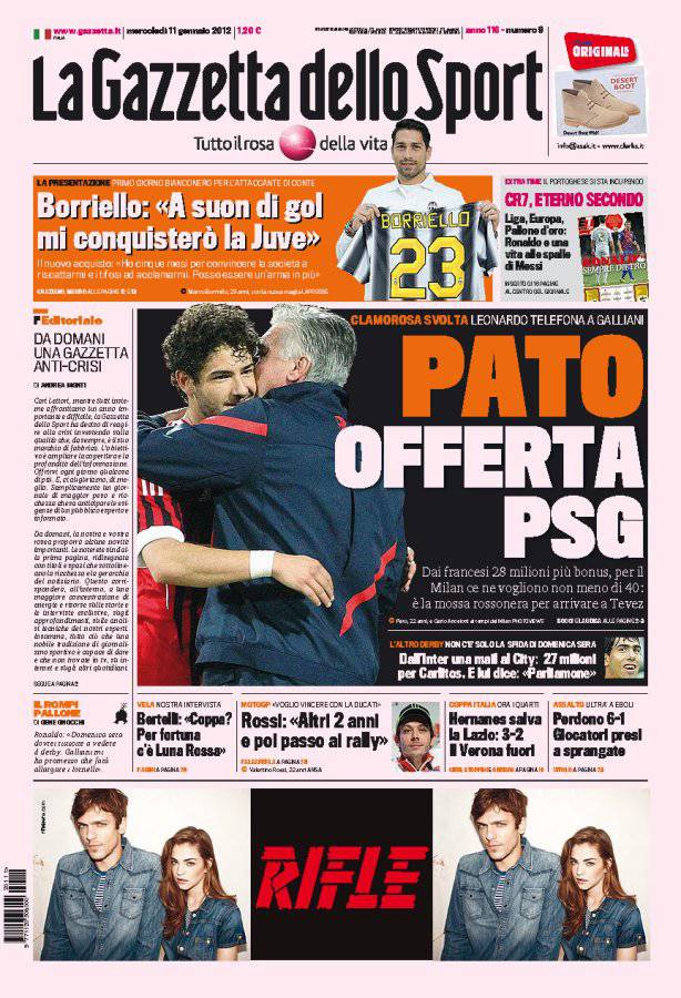 Gazzetta dello Sport: Pato, offerta Psg 11/01/2012 di admin GAZZETTA PATO PSG – Sulla Gazzetta dello Sport si parla di Pato con il Psg che non molla. La redazione di Calciomercatonews.com