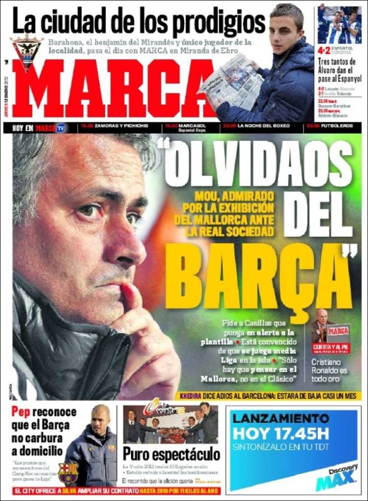 Marca: “Dimenticare il Barcellona” 12/01/2012 di admin MARCA REAL MADRID – Josè Mourinho chiede ai suoi ragazzi di non pensare alla sfida nei quarti di Coppa del Re contro il Barcellona e di pensare al Mallorca. La redazione di Calciomercatonews.com