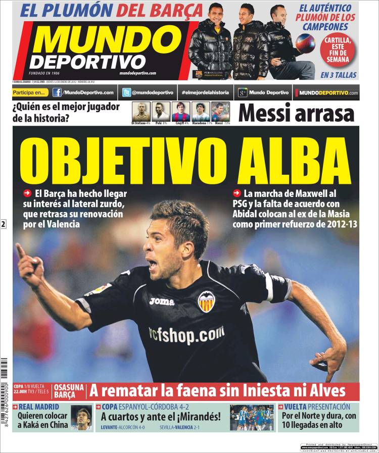 MUNDO DEPORTIVO ALBA – Sul quotidiano Mundo Deportivo si parla del Barcellona che punta Alba del Valencia.