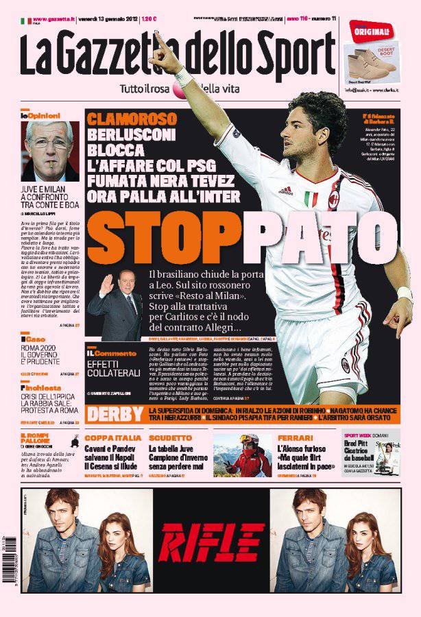 GAZZETTA PATO MILAN – Ieri giornata intensa con Pato che ha rifiutato il Psg e ha dunque bloccato la trattativa Milan-City per Tevez.