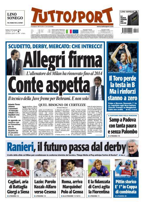 TUTTOSPORT ALLEGRI CONTE – Su Tuttosport si parla di Allegri e Conte, il primo ha rinnovato con il Milan, il secondo aspetta Behrami a centrocampo.
