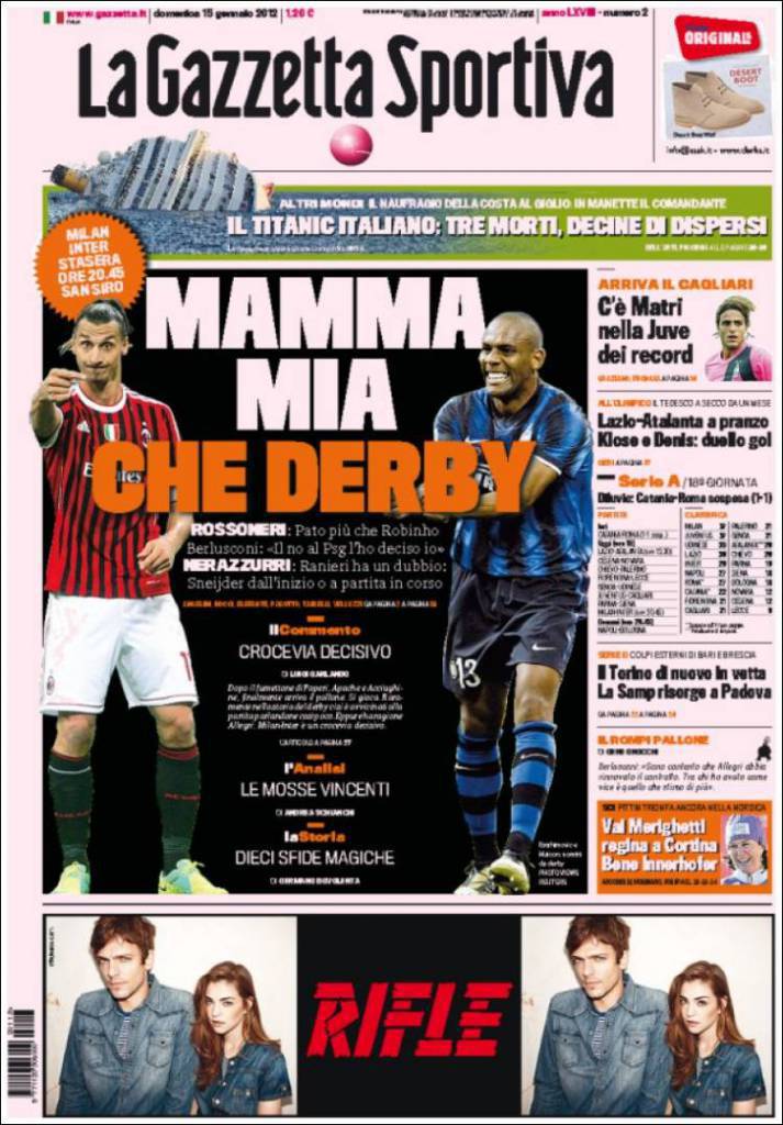 GAZZETTA DELLO SPORT MAMMA MIA CHE DERBY – Tutto pronto a Milano per il Derby della Madonnina, posticipo di questa sera. Milan contro Inter; Allegri contro Ranieri; Ibra contro Maicon, come si vede nella prima pagina della Gazzetta dello Sport. Chi avrà la meglio? Fischio d’inizio alle 20.45.
