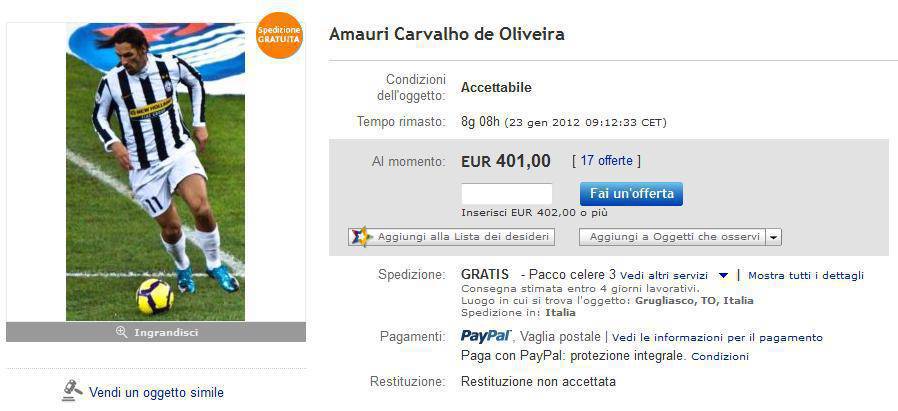 CALCIOMERCATO JUVENTUS AMAURI EBAY – I tifosi bianconeri si sono davvero stancati di attendere la cessione di Amauri, tanto da averlo messo in vendita anche sul più grande sito di aste online a livello mondiale, Ebay. L’inserzione per il giocatore è comparsa da un paio di giorni ed al momento l’asta è arrivata a quasi 400 euro. Di certo il giocatore non vive una fantastica situazione e spera anche lui di lasciare Torino in breve tempo. Caratteristiche dell’oggetto in vendita sono: condizioni accettabili, spedizione gratuita e soprattutto non è accettata la restituzione. Tra pochi giorni, forse anche grazie all’aiuto della Fiorentina, l’inserzione potrà lasciare Ebay…