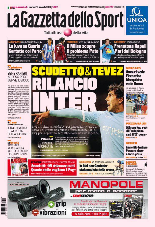 GAZZETTA SCUDETTO TEVEZ INTER – Sulla Gazzetta dello Sport si parla dell’Inter che punta allo Scudetto e anche all’acquisto di Tevez.