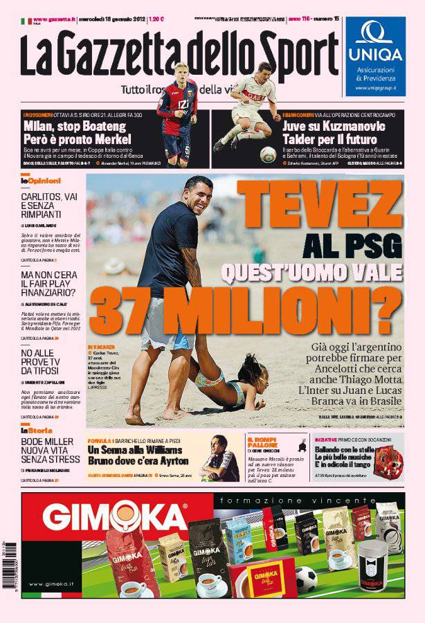 GAZZETTA TEVEZ – La telenovela Tevez è vicino alla fine. Il giocatore è a un passo dal Psg che lo pagherà 37 milioni di euro.