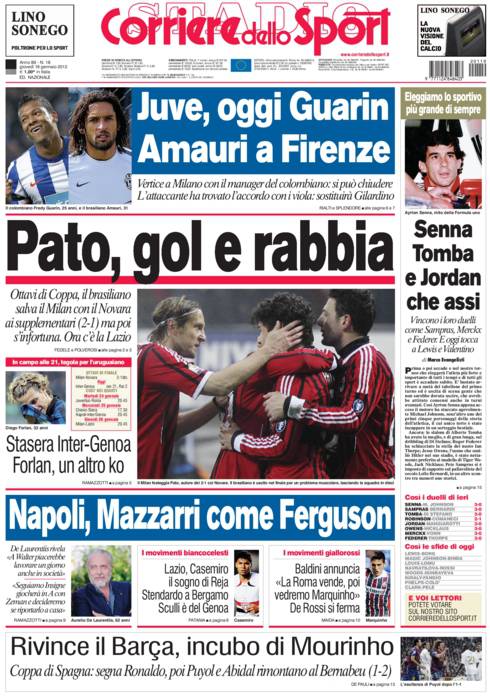 Corriere dello Sport: Pato, gol e rabbia 19/01/2012 di admin CORRIERE PATO GOL RABBIA – Sul Corriere dello Sport si parla di Pato che segna il due a uno contro il Novara e poi si fa male. La redazione di Calciomercatonews.com