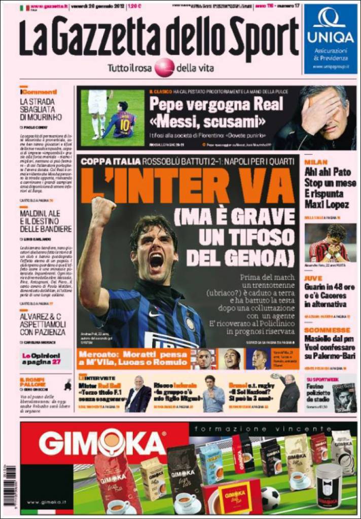 GAZZETTA DELLO SPORT – La prima pagina della Gazzetta dello Sport è dedicata alla vittoria dell’Inter sul Genoa nonchè al tifoso grave dopo una collutazione prima del match di San Siro.
