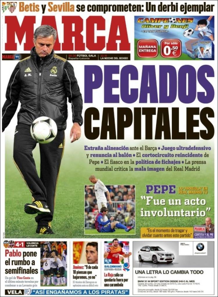 MARCA – La prima pagina del quotidiano sportivo Marca stila un’analisi degli errori di Mourinho, culminati con la sconfitta con il Barcellona.