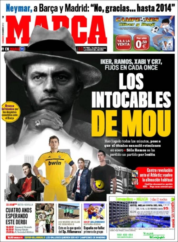 RASSEGNA STAMPA SPAGNA MARCA REAL MADRID MOURINHO – Gli intoccabili di Josè Mourinho si chiamano: Casillas, Ramos, Xabi Alonso e Cristiano Ronaldo. Sono gli unici sempre presenti nell’undici titolare. Hanno giocato ogni minuto anche se il tecnico ha annunciato la rotazione degli uomini. Solo Ramos ha perso una partita per infortunio.