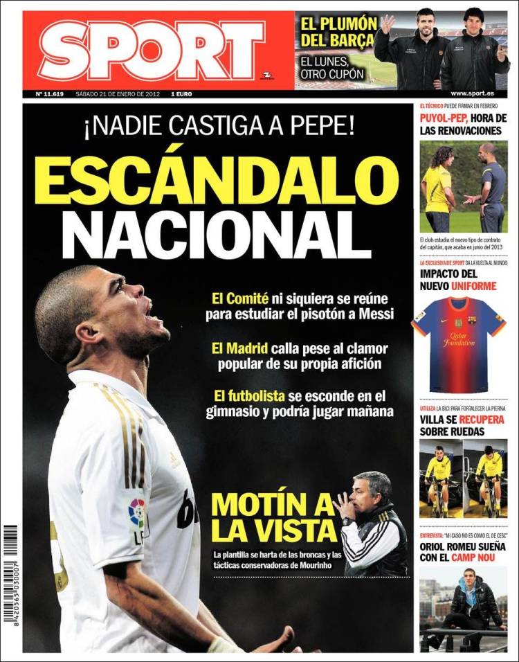 RASSEGNA STAMPA SPORT PEPE -Pepe, diventa lo scandalo nazionale. Anche il comitato si è riunito per discutere il pestone a Messi. Il Madrid non rispone nonostante il clamore proprio dei suoi tifosi. Pepe resta nascosto in palestra e domani potrebbe giocare.