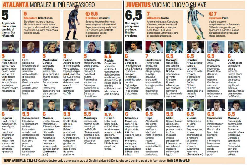 ATALANTA JUVENTUS VOTI PAGELLE GAZZETTA SELLO SPORT – Grande prova quella della Juventus ieri sera che, allo stadio Atleti Azzurri d’Italia, ha battuto per 2-o l’Atalanta, laureandosi campione d’inverno. Gli uomini di Conte, con grande rabbia ed abnegazione, hanno meritato ieri sera il risultato, arrivato grazie alle reti di Stephan Lichtsteiner ed Emanuela Giaccherini. Leggiamo adesso i voti e le pagelle della partita, secondo quanto pubblicato dalla Gazzetta dello Sport: