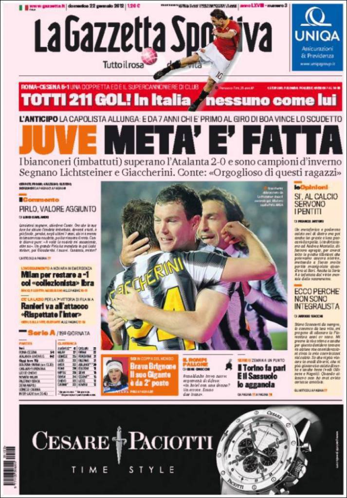 GAZZETTA DELLO SPORT JUVENTUS – Ottima prova della Juventus ieri sera che, con un ottimo 2-0, è riuscita a superare l’Atalanta grazie alle reti di Lichtesteiner di Giaccherini. I bianconeri così si laureano campioni d’inverno, titolo virtuale che però può soddisfare, e non poco, Antonio Conte. Ai Torinesi è dedicata la prima pagina della Gazzetta dello Sport.