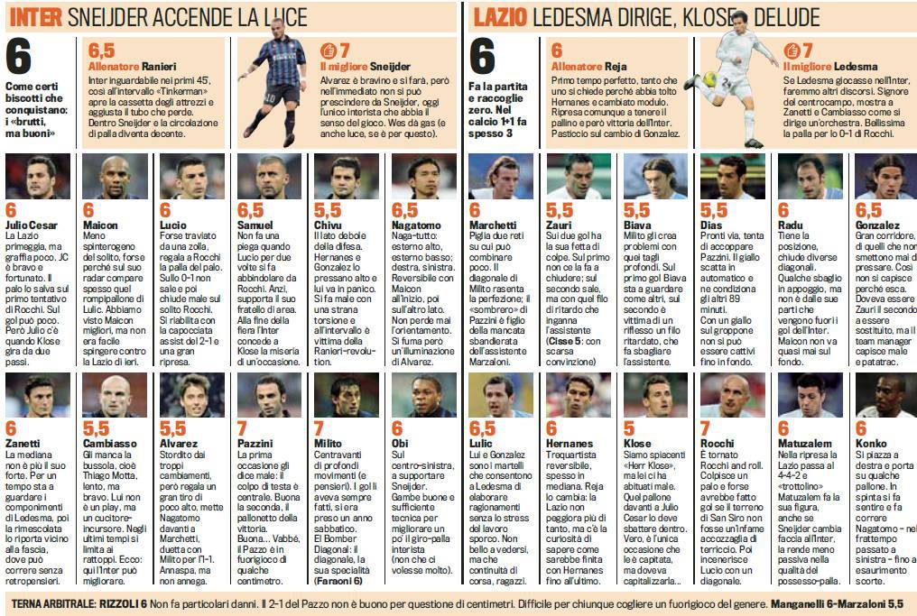 INTER LAZIO VOTI PAGELLE GAZZETTA – Continua il momento magico dell’Inter all’ottava vittoria consecutiva. La squadra di Ranieri però ieri sera contro la Lazio non ha fatto una grande partita, ma i tre punti servono ai nerazzurri per scavalcare proprio la formazione di Reja al quarto posto e continuare la rincorsa al trio davanti. Lazio in vantaggio con Rocchi, il pareggio all’ultimo minuto del primo tempo con Milito. Nella ripresa gol vittoria di Giampaolo Pazzini, anche se il gol dell’ex Sampdoria è viziato da fuorigioco. Ecco i voti e le pagelle della Gazzetta dello Sport.