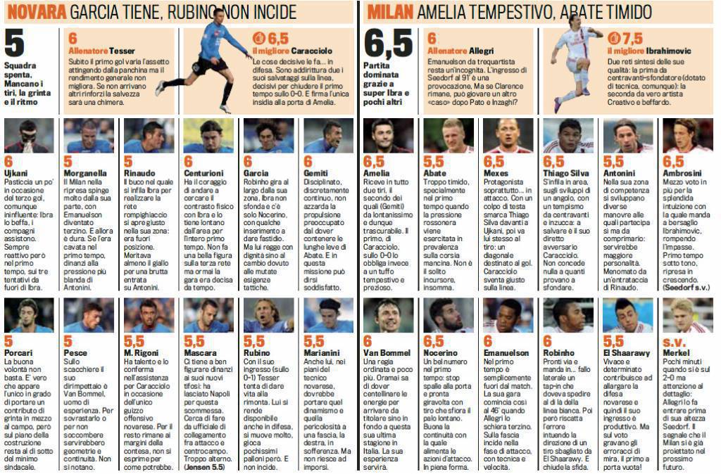 NOVARA MILAN VOTI PAGELLE GAZZETTA FOTO – Sulla Gazzetta dello Sport si celebra la grande partita del Milan che vince tre a zero a Novara. I rossoneri portano a casa una vittoria importante con doppietta di Ibrahimovic e gol di Robinho. Lo svedese è autore di due gol importanti, soprattutto il secondo di tacco, marchio di fabbrica del genio svedese. Il Novara nulla ha potuto contro la forza del Milan, anche se la formazione piemontese ha resistito un tempo. Voti e pagelle della Gazzetta dello Sport.