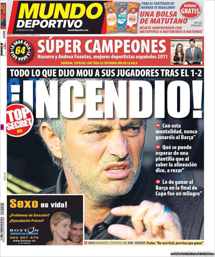 MUNDO DEPORTIVO MOURINHO – Sul quotidiano Mundo Deportivo ci sono le dichiarazioni di Mourinho ai suoi giocatori dopo il due a uno contro il Barcellona.