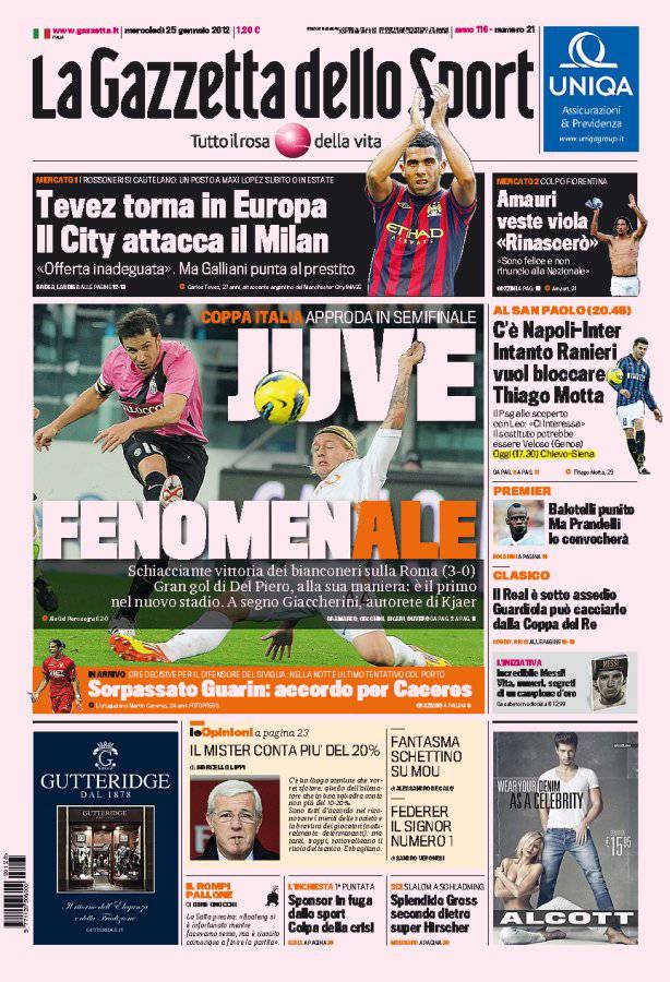 GAZZETTA JUVENTUS – La Juventus travolge tre a zero la Roma in Coppa Italia e si qualifica per le semifinali. Straordinario gol di Del Piero.